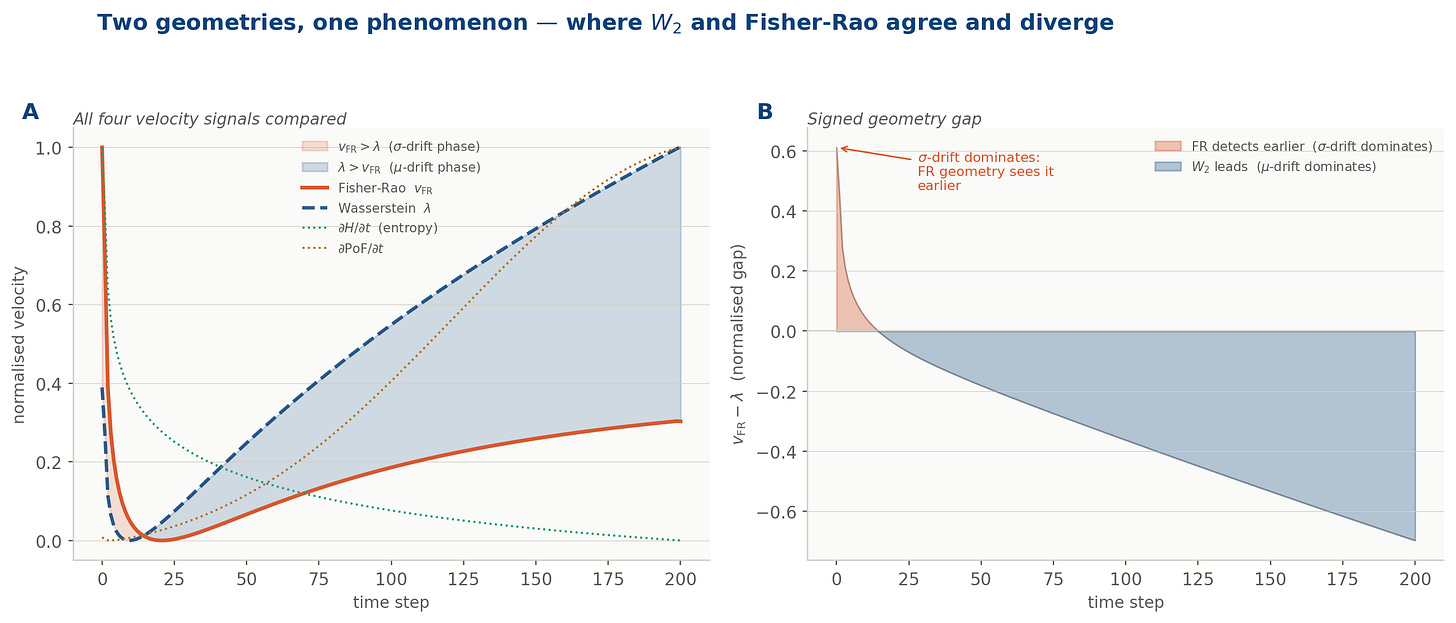 Panel B: the signed geometry gap. The rose region is where σ-drift dominates and Fisher-Rao detects the acceleration earlier. The navy region is where μ-drift dominates and W₂ leads. The two geometries agree on the presence of drift; they disagree on when it becomes dangerous.
