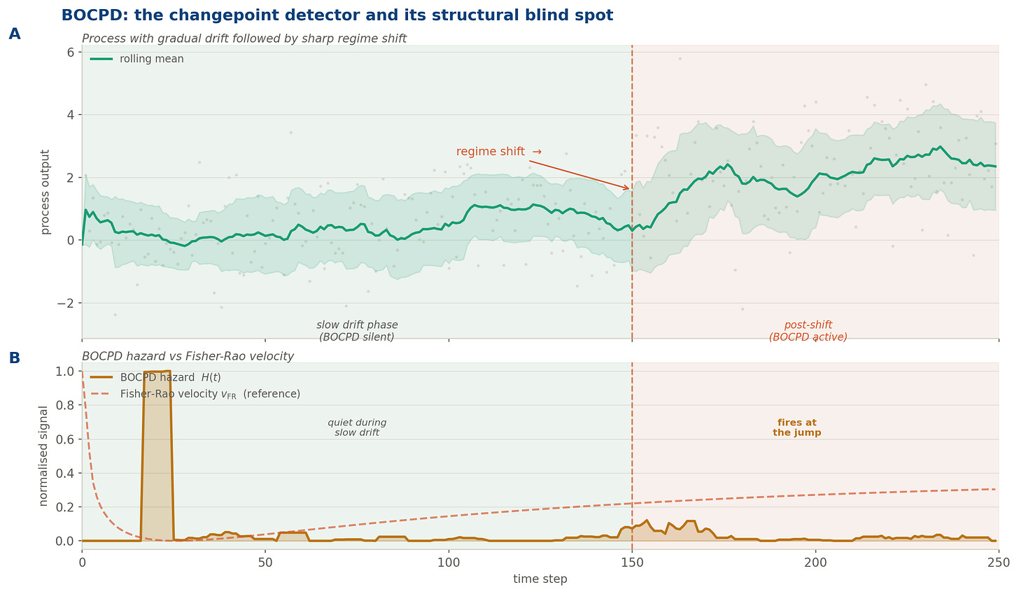 A two-phase process: gradual drift (0–150) followed by a sharp regime shift (at t = 150). Panel A shows the raw process, rolling mean, and ±1σ band. Panel B overlays the BOCPD hazard signal (amber) against the Fisher-Rao velocity (rose dashed). BOCPD is quiet during the slow drift phase: its projection angle simply cannot see smooth distributional travel. It fires decisively at the discontinuity. The Fisher-Rao velocity, by contrast, is elevated throughout the drift phase and would have flagged the departure from baseline long before the jump.