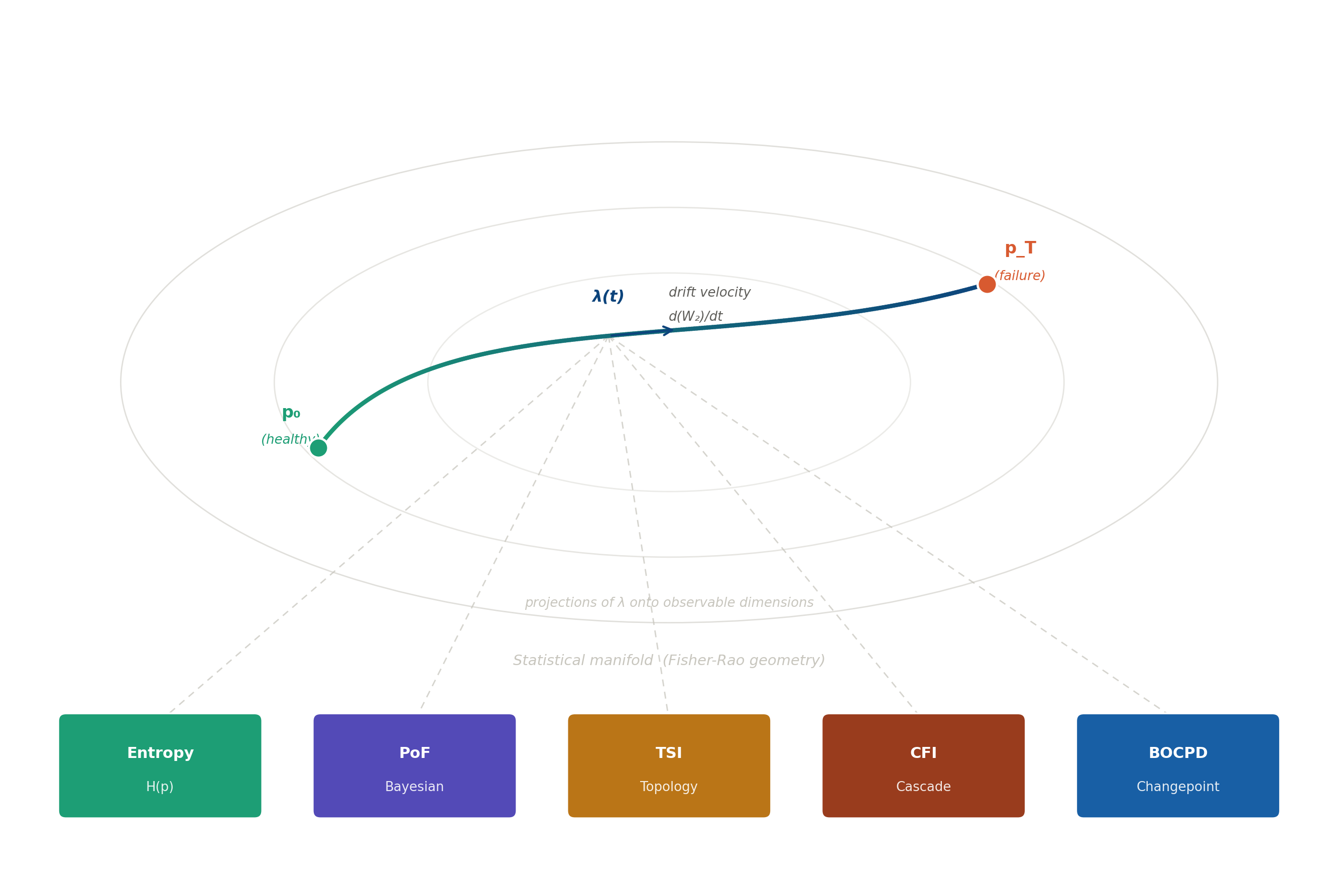 The nested ellipses are not decorative: they are the contour lines of the Fisher-Rao metric, the geometry of statistical distinguishability. Every point on this surface is a probability distribution. Every path through it is a trajectory of change. The blue curve is a real process travelling from its healthy baseline p₀ toward failure at p_T. The arrow mid-trajectory is λ(t), the drift velocity: not a metaphor but a derivative, a rate of change measured in the geometry of optimal transport.