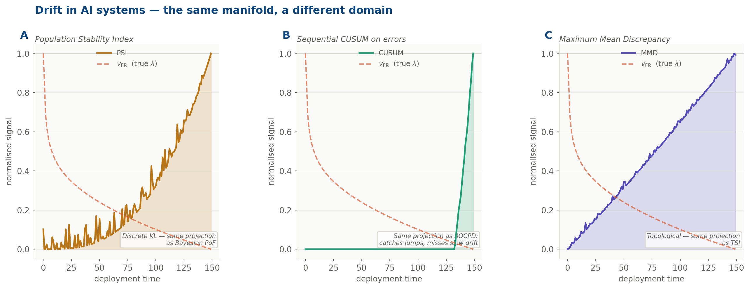 The three canonical ML drift detectors (PSI, CUSUM, MMD) overlaid against the Fisher-Rao velocity of the same drifting process. Each captures a different projection of λ. None captures the full object. The rose dashed line: v_FR: is what all three are approximating, from their respective angles.