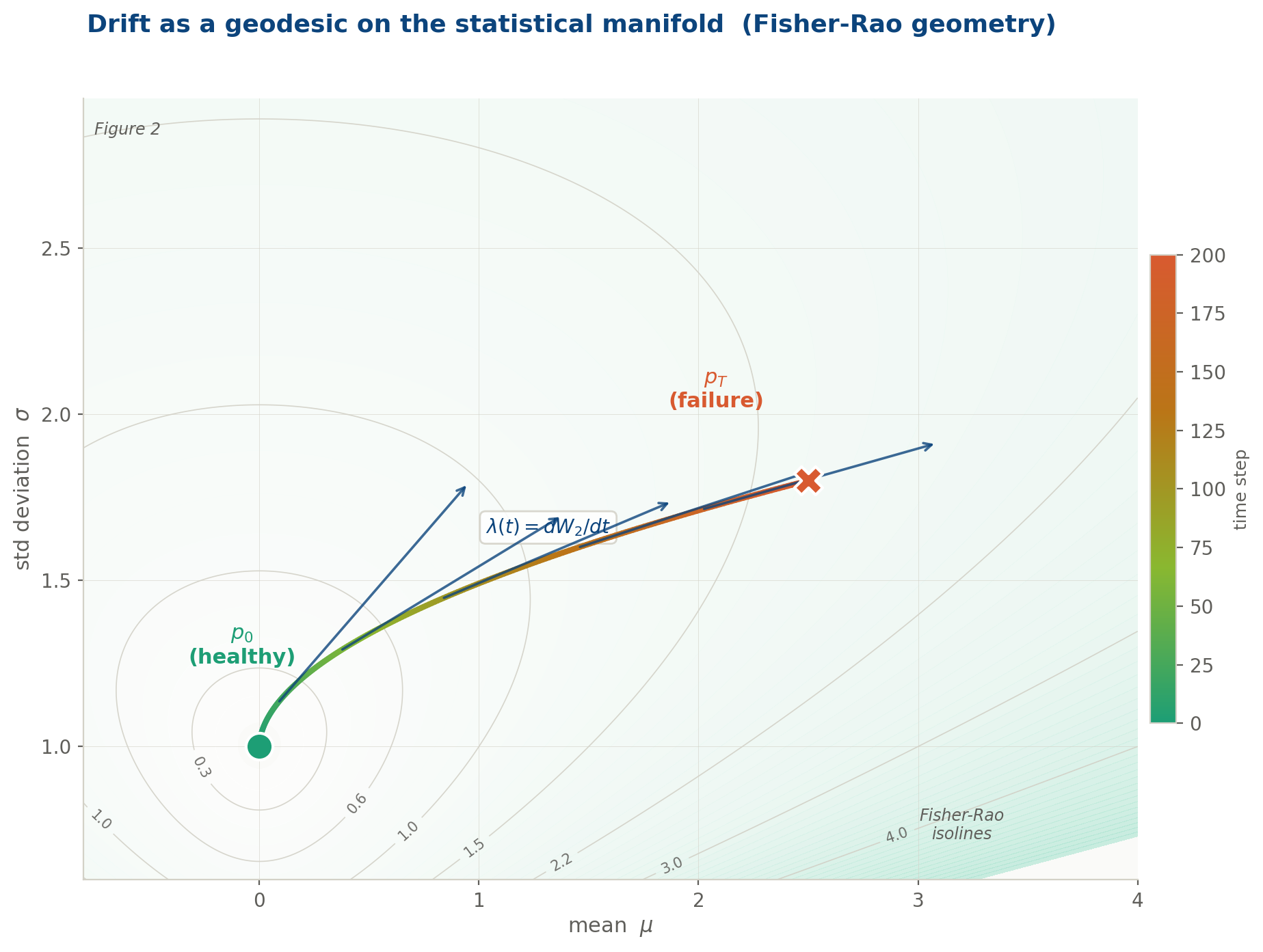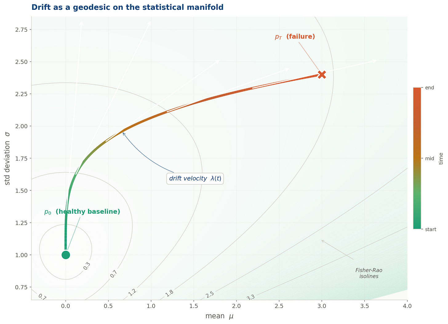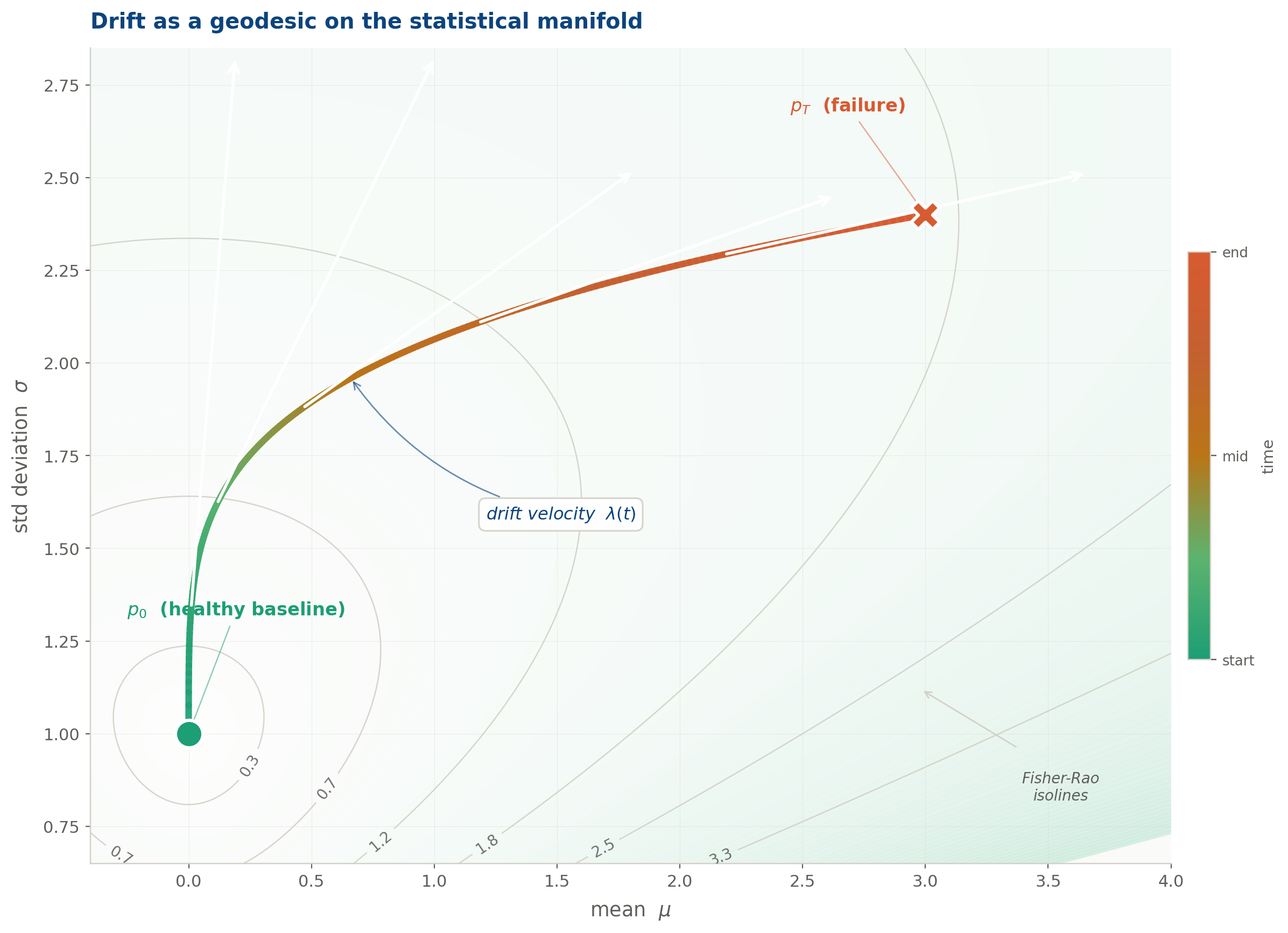 The drift trajectory plotted directly in (μ, σ) parameter space, the statistical manifold of the Gaussian family. The trajectory is colour-graded from teal (healthy baseline p₀) through amber to rose (failure state p_T). Fisher-Rao isolines show the geometry: each contour is a set of distributions at equal statistical distinguishability from p₀. The trajectory curves steeply at first as σ rises, then sweeps right as the mean accelerates. The white arrows show drift velocity at five points along the path.