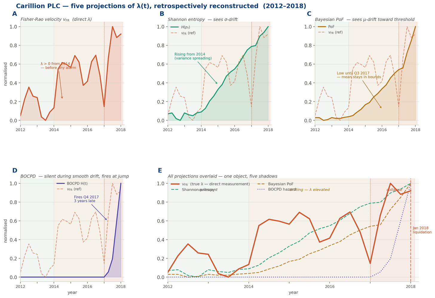 etrospective reconstruction of the five projection instruments applied to Carillion’s distributional trajectory (2012–2018). Panel A: the Fisher-Rao velocity: the direct λ(t): rising from 2014, three years before any public alarm. Panels B–D: Shannon entropy (detects σ-drift from 2014), Bayesian PoF (low until Q3 2017, because the mean stayed in bounds), and BOCPD (silent through the entire drift phase, firing only at the discontinuity in Q4 2017). Panel E: all signals overlaid. One geometric object.
