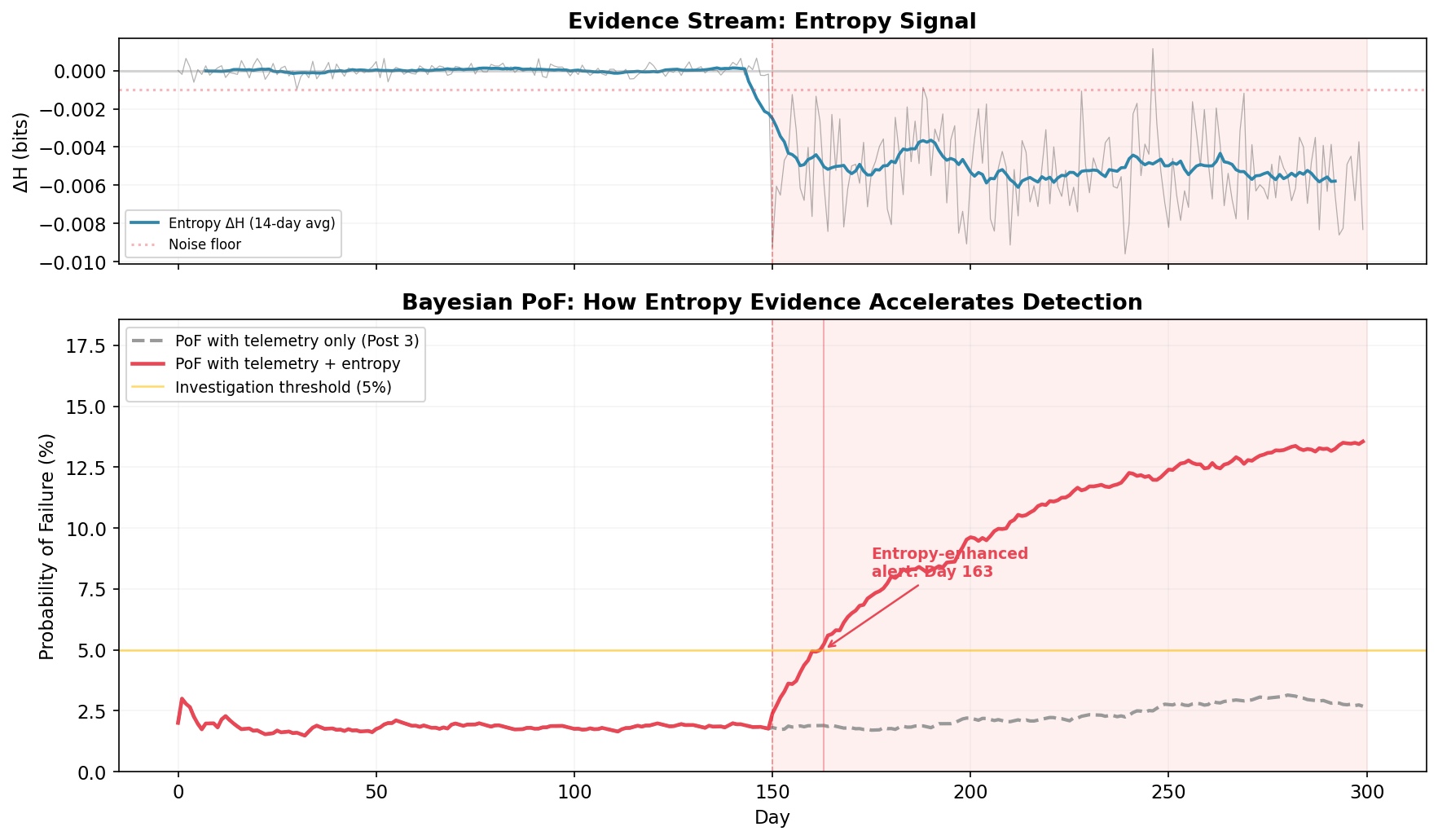 The red line adds entropy evidence. The moment ΔH drops below the noise floor and stays there, the Bayesian posterior shifts. The combined PoF crosses the investigation threshold on Day 163, thirteen days after onset. By Day 200, it’s above 8% and climbing. The framework isn’t just detecting the problem earlier, it’s expressing growing confidence that something is wrong, exactly as it should.
