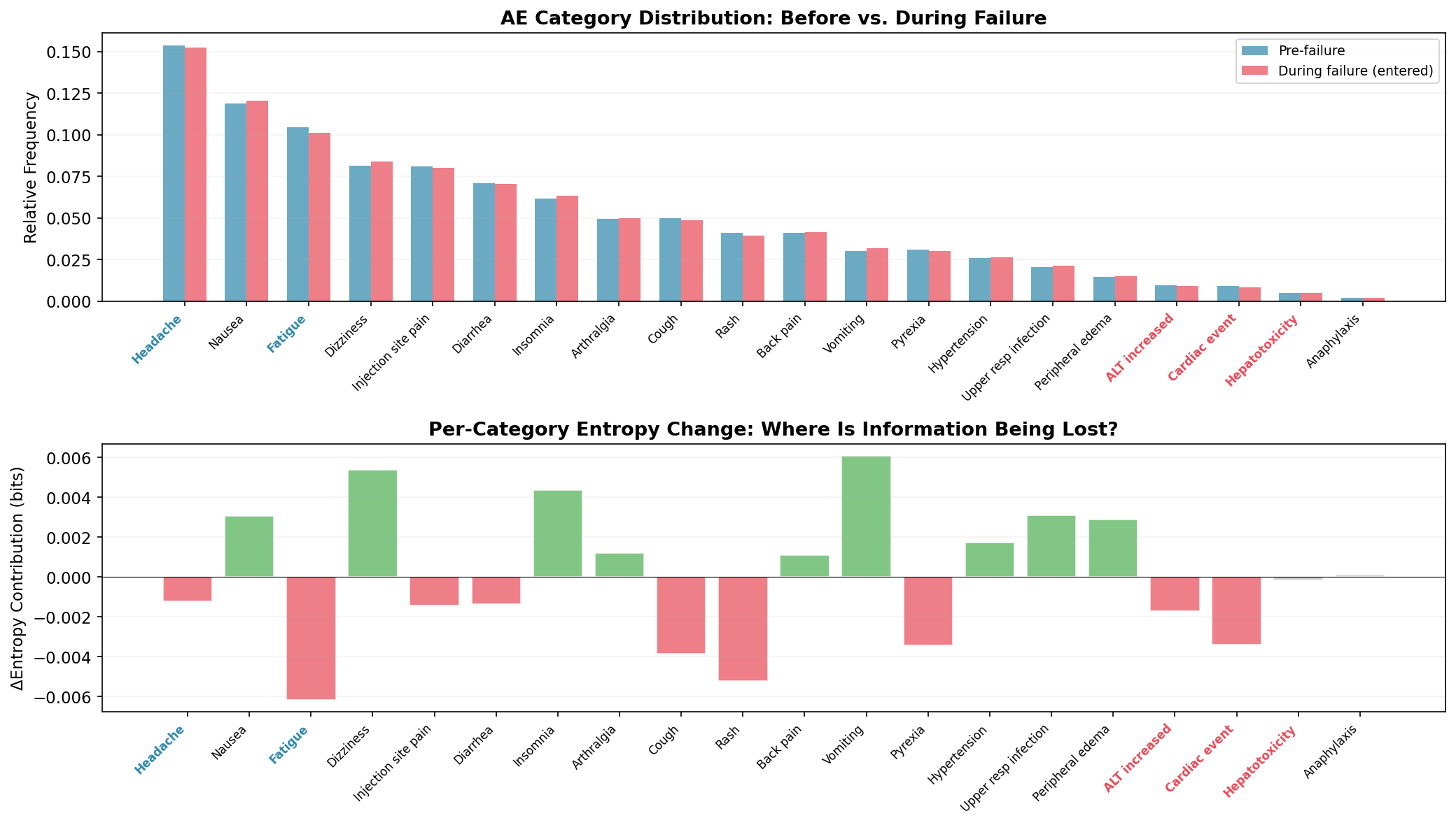 The top panel compares category frequencies before and during the failure. The changes are subtle (one site out of fifty) but visible: the red-labeled categories (ALT increased, Cardiac event, Hepatotoxicity) show frequency reductions; the blue-labeled redirect targets (Headache, Fatigue) show increases.