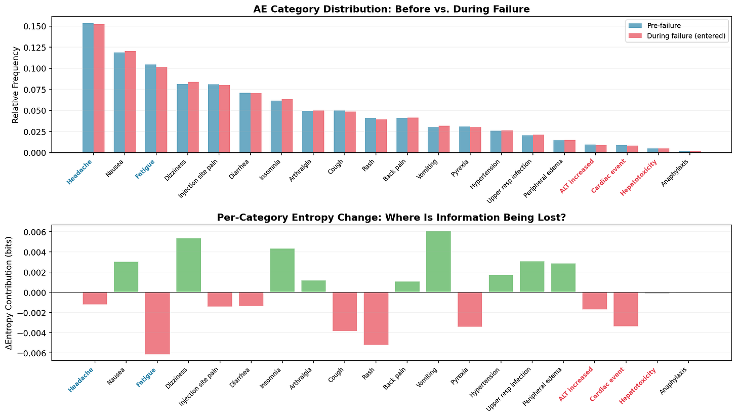 The bottom panel decomposes the entropy change per category. It’s noisy - and I want to be honest about that. Rash, Cough, and Diarrhea show non-trivial shifts from pure sampling variation, not from the actual failure. The decomposition narrows the search space but doesn’t eliminate false leads. You’d cross-reference against coding logs, interview the site monitor, check for staffing changes. The chart generates hypotheses; the auditor tests them.