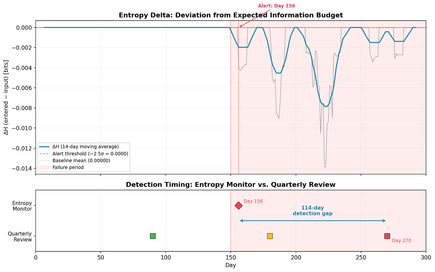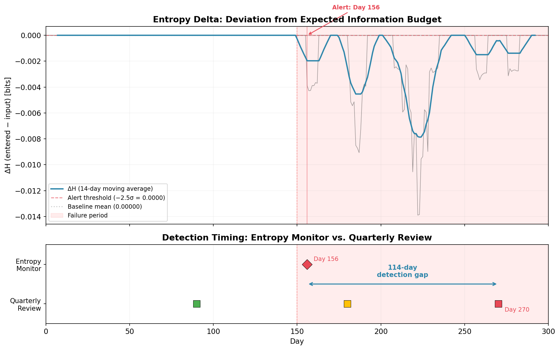 The top panel shows the entropy delta (ΔH = entered − input) over time. The 14-day moving average makes the signal readable. Before Day 150: flat at zero. After: an immediate, sustained drop to −0.002 to −0.014 bits. The entropy budget is being violated.