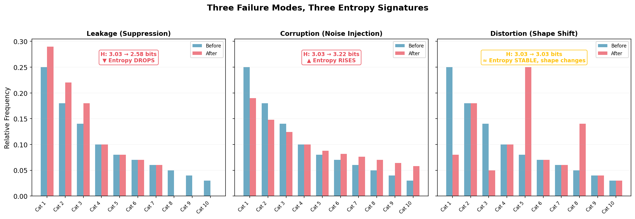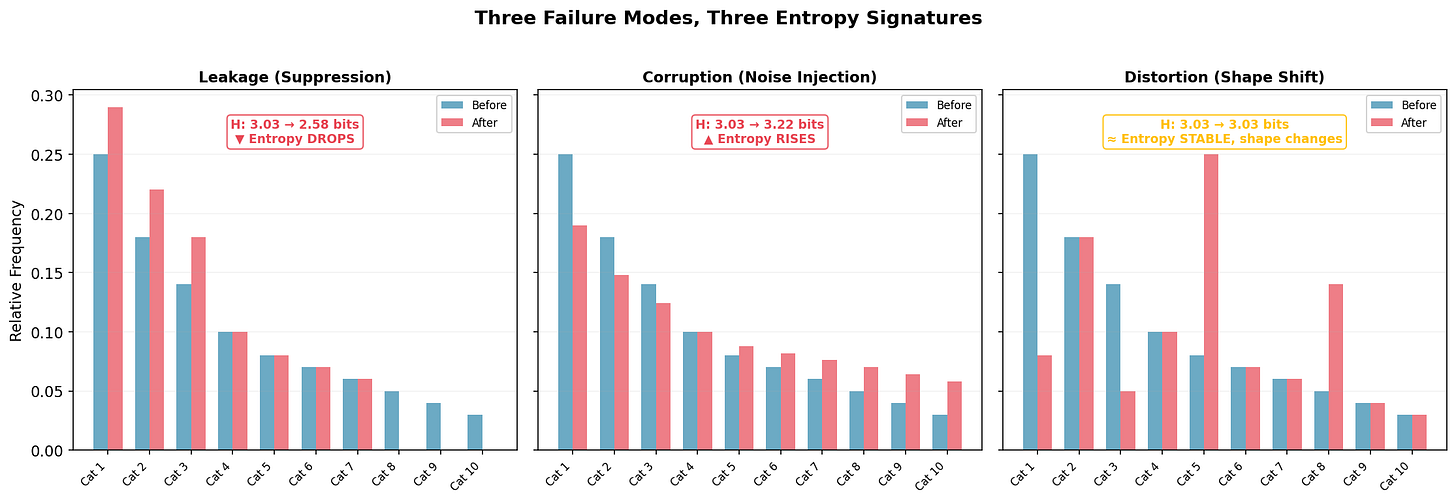 Distortion (right): Entropy stays at 3.03 bits but the shape changes, categories swap importance. The subtlest and most dangerous mode, because aggregate entropy won’t catch it. You need per-category decomposition to see it. This might be systematic recoding: one category recorded as another, preserving total diversity but corrupting the underlying pattern. Notice: if you rely on aggregate entropy alone, you miss this entirely.