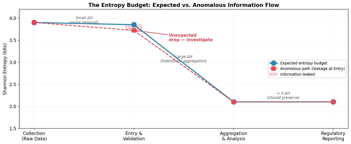 The blue line shows the expected budget: a small reduction at validation (noise removal), a large reduction at aggregation (summarization by design), and preservation through reporting. The dashed red line shows what happens when something goes wrong at Entry, an unexpected drop. The pink gap is information that leaked without authorization. That gap is measurable in bits. And it’s a signal worth investigating.
